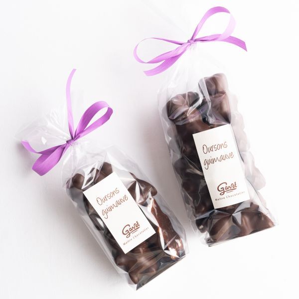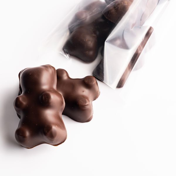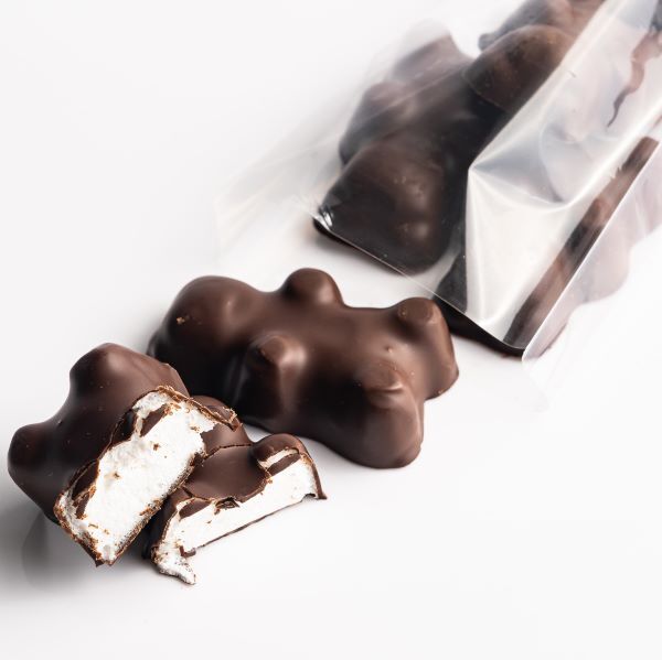 Les oursons guimauve, une guimauve moelleuse enrobée d’une fine couche craquante de chocolat noir.